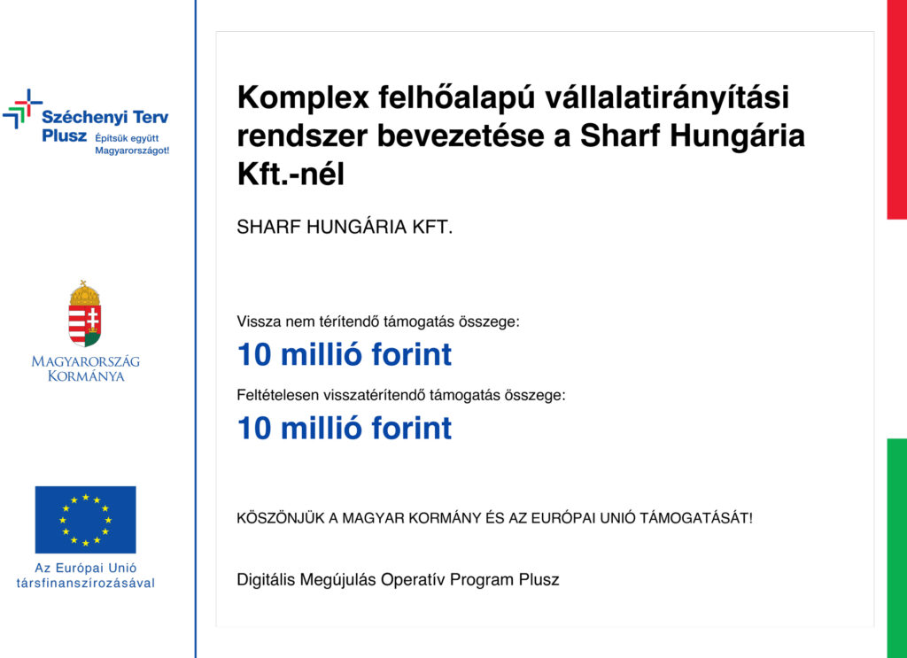 A Sharf Hungária Kereskedelmi és Szolgáltató Kft. 20 millió forint visszatérítendő európai uniós támogatásban részesül a Széchenyi Terv Plusz program keretében meghirdetett DIMOP Plusz-1.2.3/A-24 számú felhívásra benyújtott projektje révén. A projekt célja a Cloud9 ERP rendszer bevezetése, amely digitalizálja és hatékonyabbá teszi a vállalat működését, hozzájárulva a cég hosszú távú versenyképességéhez. A projekt a Digitális Megújulás Operatív Program Plusz keretében valósul meg.